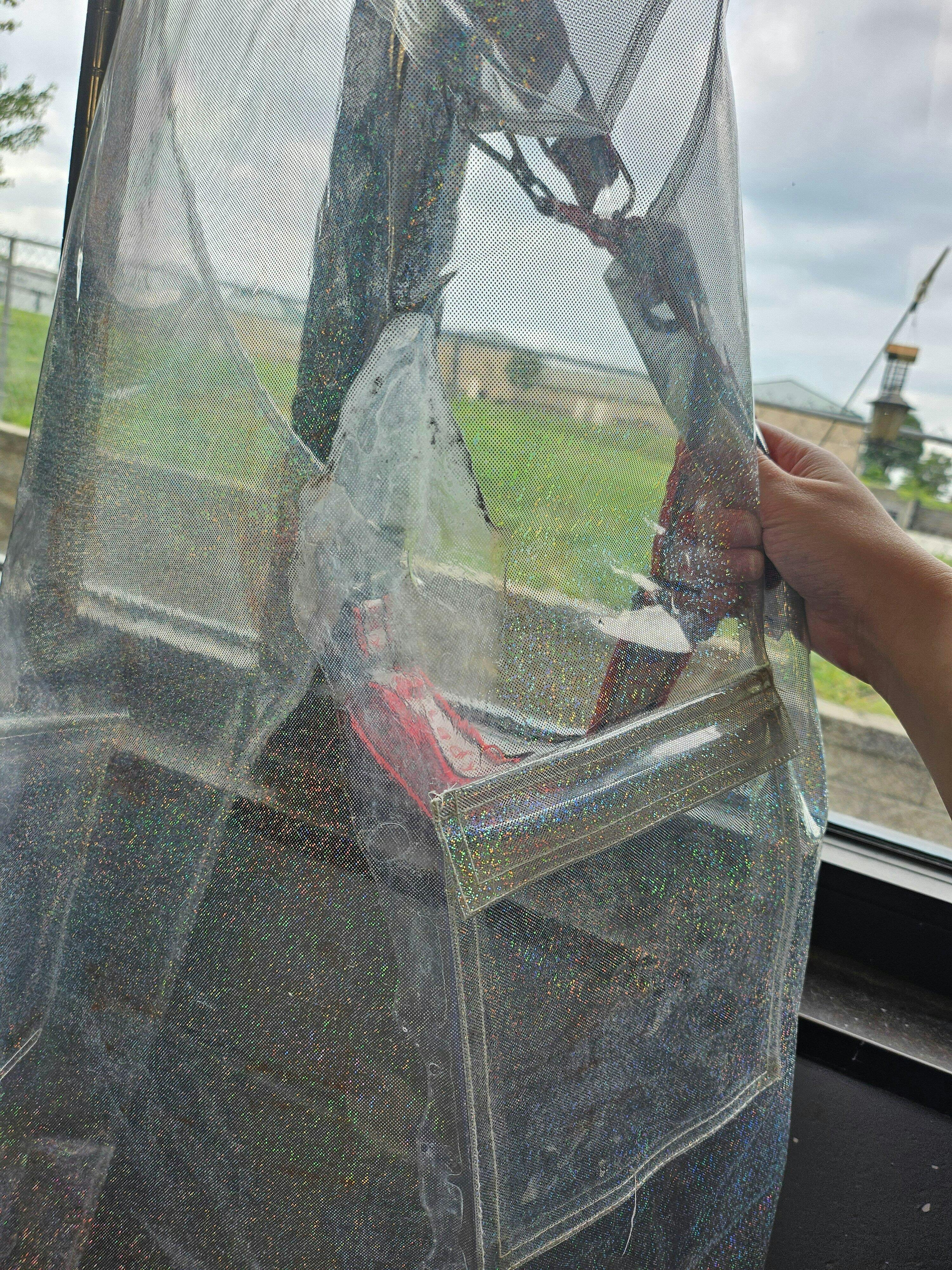 Waterproof and Hair resistant, clear sparkle material, Adjustable cross over straps for easy lightweight wear and 2 deep front pockets with lapels to prevent the hair and debris from getting in. No more neck pain, just great coverage and style. One size fit most.